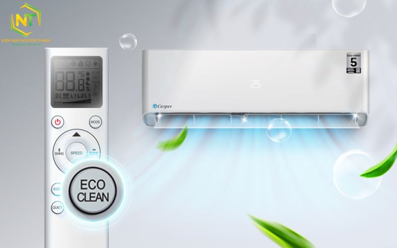 Chỉ một thao tác với nút Eco Clean, điều hòa Casper 9000btu sẽ tự động điều chỉnh nhiệt độ về 26°C. Chế độ này giúp cắt giảm hóa đơn tiền điện đáng kể nhưng không làm giảm hiệu suất làm lạnh của máy.